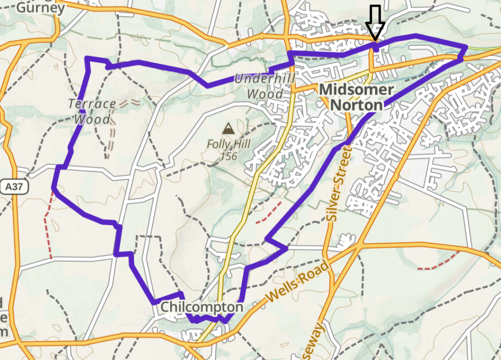 Midsomer Norton has what they call Greenways, which are disused railway lines. The start of the walk was part way along the former railway from Bristol to Frome, which joined up with the main Somerset and Dorset Railway from Green Park Station in Bath to the south coast. We went from one to the other along a short section of the Fosse Way. The path was tarmac as far as Midsomer Norton Station, which has a restored section of the line. From there, we followed the line to its end at the disused Chilcompton Tunnels, which we skirted around then rejoined the railway path after that.